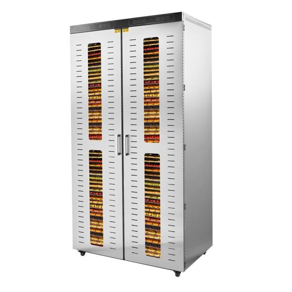 Bu gıda kurutma makinesi, endüstriyel ölçekte gıda kurutma ihtiyaçlarını karşılamak için 110 kg kapasiteye sahip 108 tepsiye sahiptir.  Sezgisel dijital kontrol paneli, 0 ila 24 saat arasında değişen kurutma sürelerinin ve 30°C ile 90°C arasında sıcaklıkların kolayca ayarlanmasını sağlar.