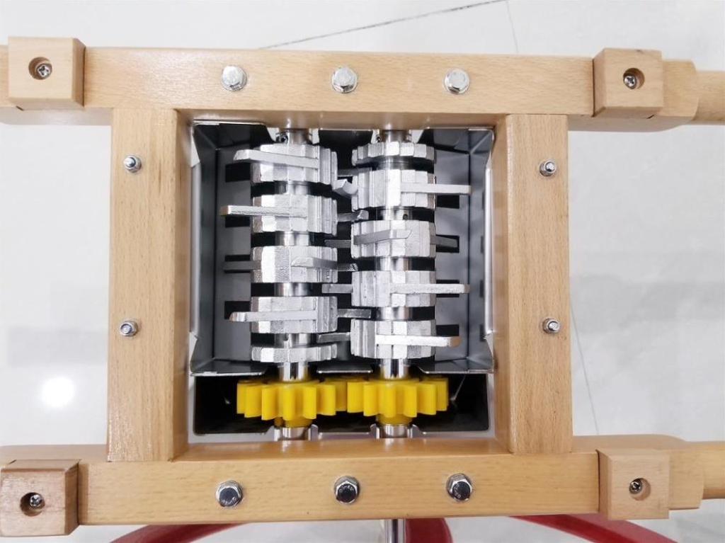 Özellik: 1. Hazneye düşen yarıya veya çeyrek elma veya armutlar bıçakların üzerine düşer, kesilir ve daha sonra el çarkı döndürüldüğünde silindirler tarafından ezilir.